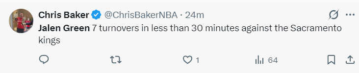 此役杰伦-格林拿到全队最高的20分,31分钟,16中7,三分8中2,罚球4中4,拿到20分4篮板1助攻4抢断1盖帽7失误,命中率43.8%,三分命中率28.6%,正负值+8。此役杰伦-格林7次失误创造了太阳生涯新高,他上一次单场7个失误还要追溯到2025年1月29日(火箭VS老鹰)